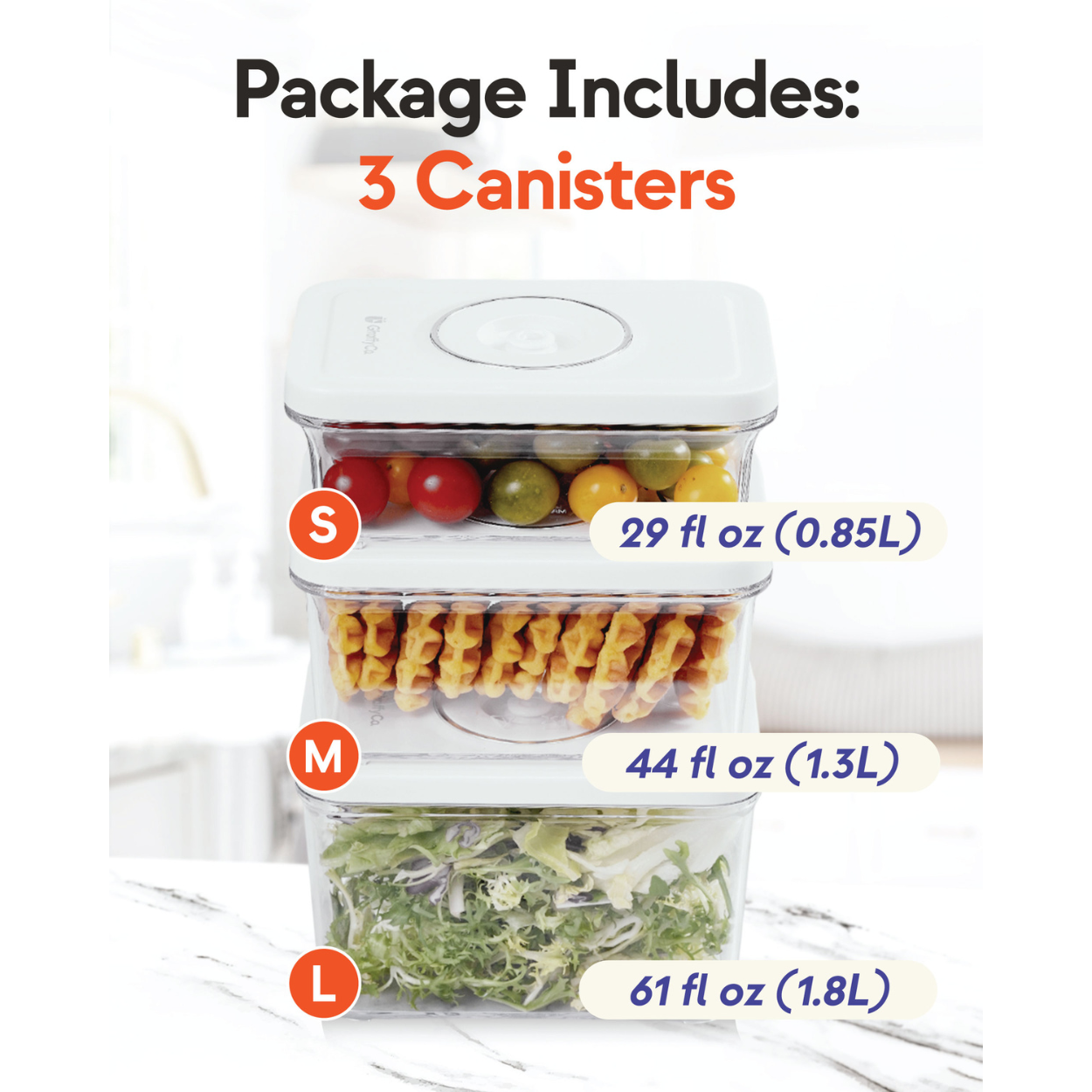 - Set includes: 3 vacuum canisters (0.85L, 1.3L, 1.8L)