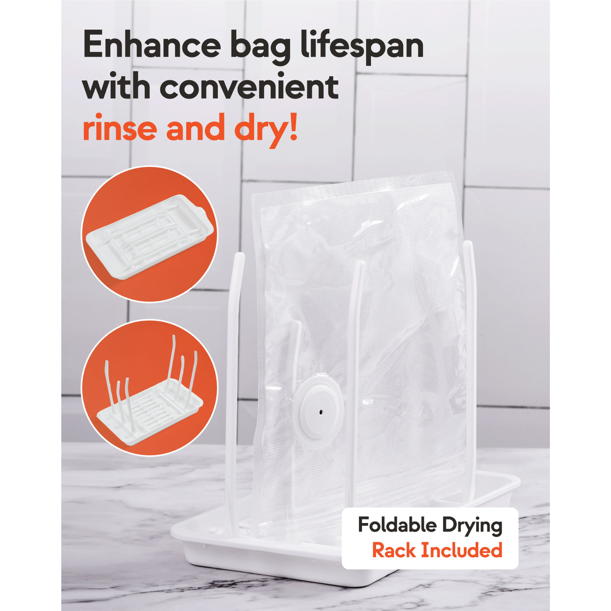 Unlike standard sealers, our innovative water tank design protects the motor from liquids, making it safe to preserve juicy steaks, marinated meats, or freshly cut fruit without worry. The foldable drying rack makes it effortless to clean and reuse the eco-friendly bags, helping you cut down on single-use plastics while saving money. With three different bag sizes, you’ll have the flexibility to portion snacks, freeze leftovers, or store bulk ingredients with ease.